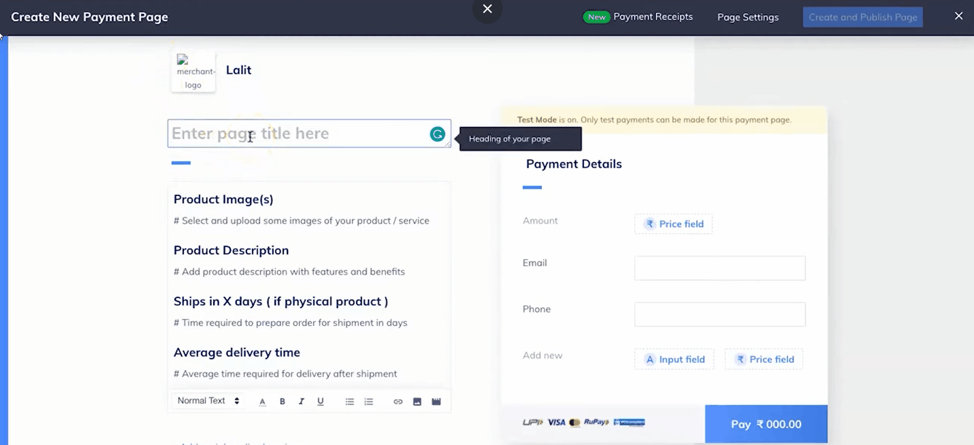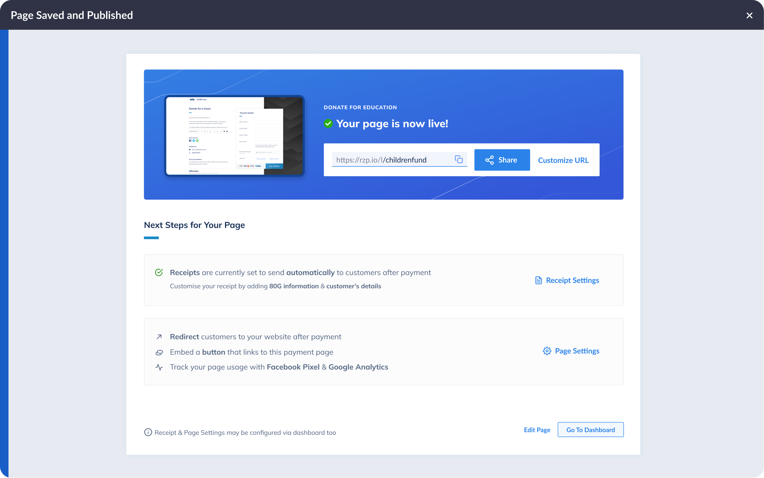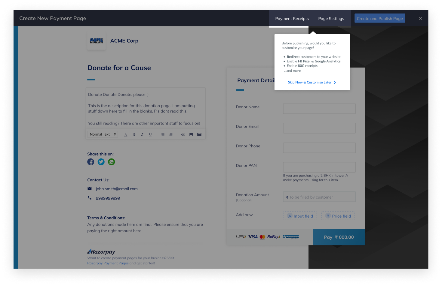 Razorpay Payment Page is a product that helps small businesses easily collect payments from their customers through a custom hosted webpage. Use cases: selling products/tickets; collecting fees/donations