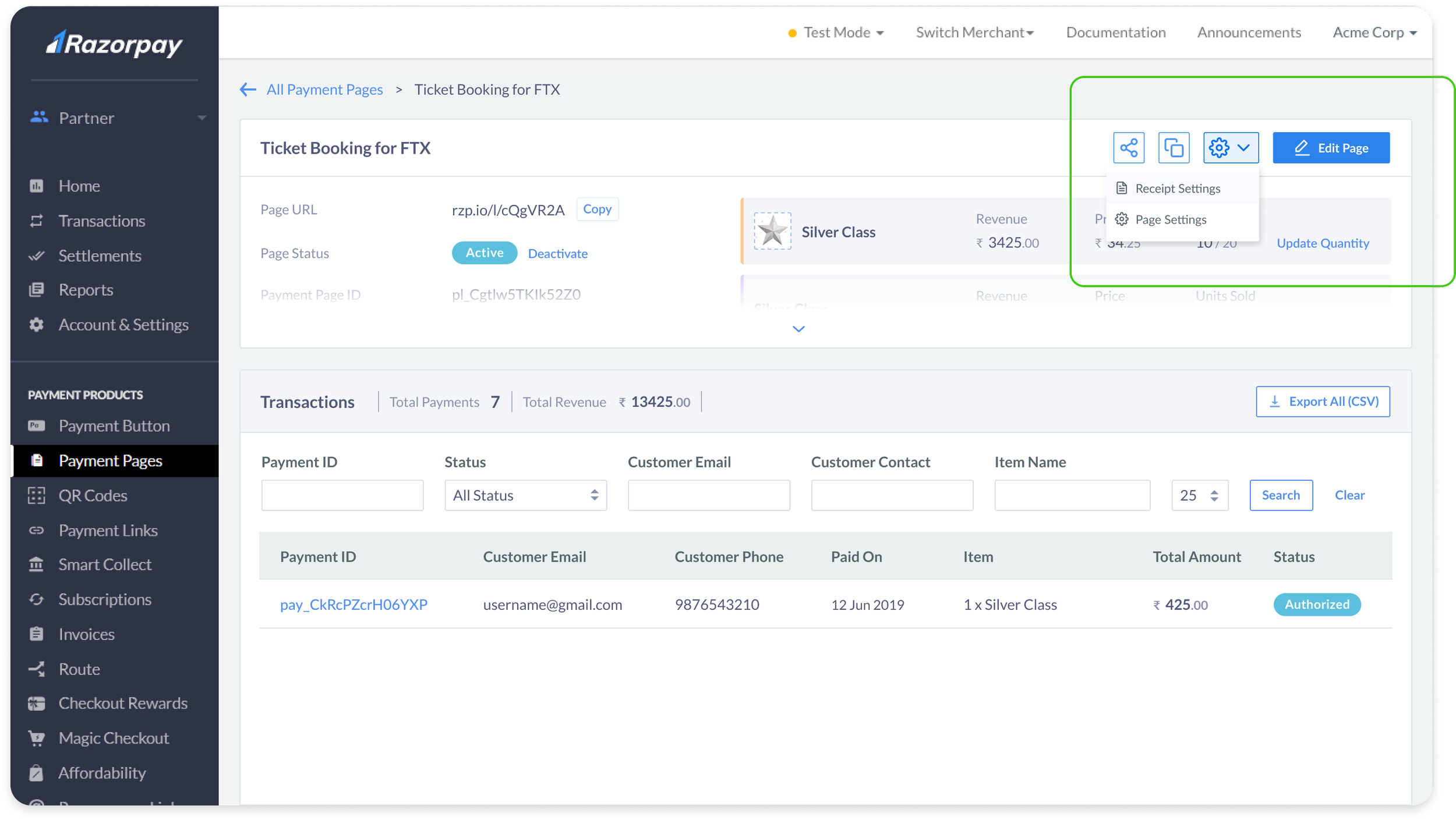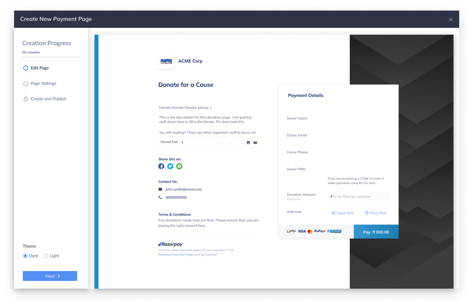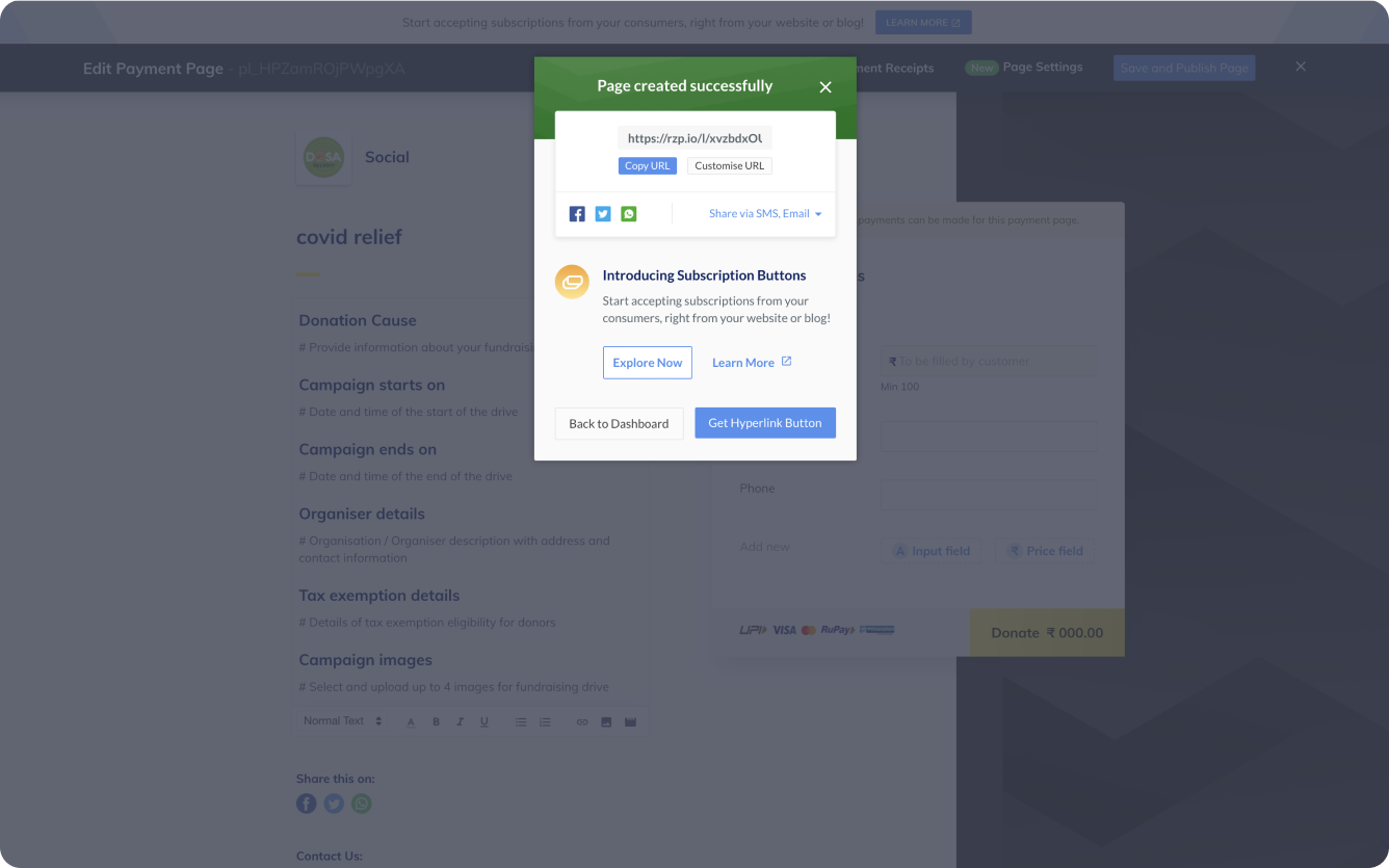 Razorpay Payment Page is a product that helps small businesses easily collect payments from their customers through a custom hosted webpage. Use cases: selling products/tickets; collecting fees/donations